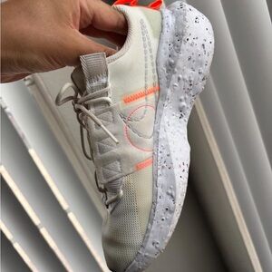 Stylish Nike sneakers with a speckled sole. Cream upper with orange accents. Perfect for casual wear.