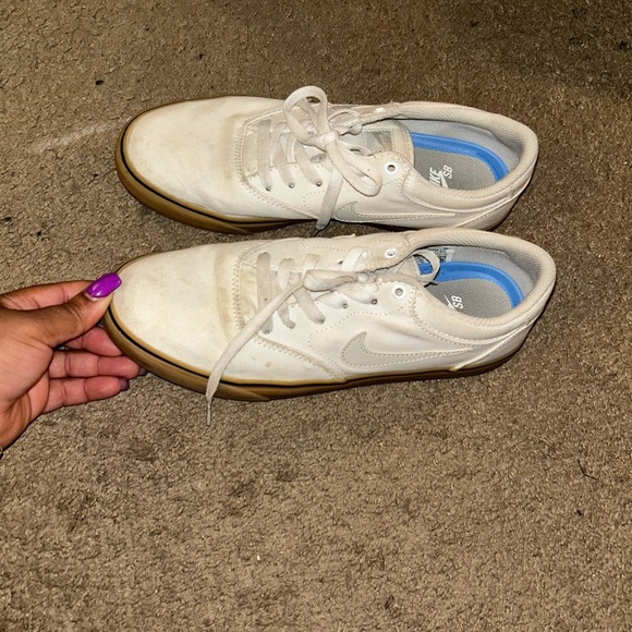 Cream Nike sneakers with a brown sole. Iconic swoosh on the side. Ideal for casual outings. Preloved shoes with small stain to front and lace is ripped at tip