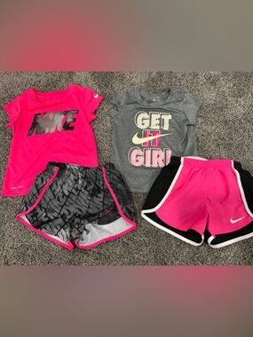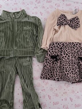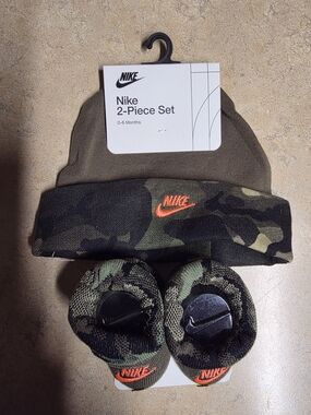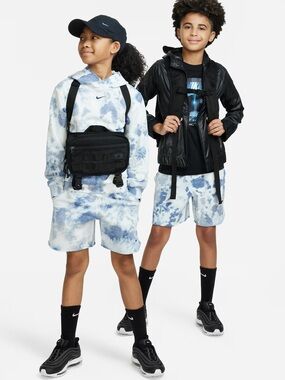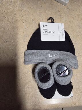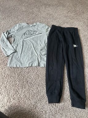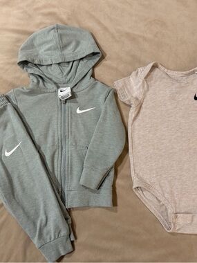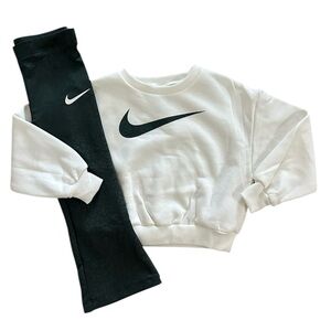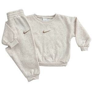 Matching Nike hoodie and joggers in a soft cream tone. Black and white Nike logos on chest and leg. Comfortable sporty silhouette. Easy pull-on hoodie and elastic waist joggers.