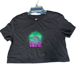 Comfortable black tee with bold green and purple Nike design. Ideal for casual wear.