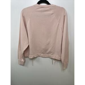 Light pastel baby pink sweatshirt, crewneck , high low, cropped with drawstring tie accents on front.
