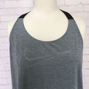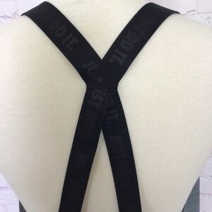 Nike cutout Swoosh gray and black tank top. Just Do It is printed on the black adjustable straps. Made of a polyester / spandex blend. Machine washable. Great pre-owned condition. No rips, holes or stains. Smoke free home.