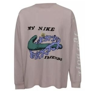 Introducing the Nike DZ3080-699 Men Sportswear My Nike Friends Pink Long Sleeve T Shirt in size L. This sweatshirt features a crew neck and relaxed fit, with long sleeves adorned with an embroidered Nike logo. The pink multicolor design includes a graphic print, making it a stylish addition to any wardrobe.