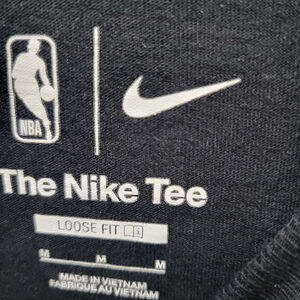 Nike Dallas Mavericks Loose Fit Crewneck T-shirt in size Medium is a stylish and comfortable addition to any man's wardrobe. With a black color and graphic print featuring the Dallas Mavericks logo, this shirt is perfect for sports fans looking to show their team allegiance. Made of machine washable cotton material, this regular fit shirt is ideal for wearing in the summer, fall, or spring seasons. The crew neck and short sleeves make it a versatile piece that can be paired with shorts or jeans for a casual and trendy look.
