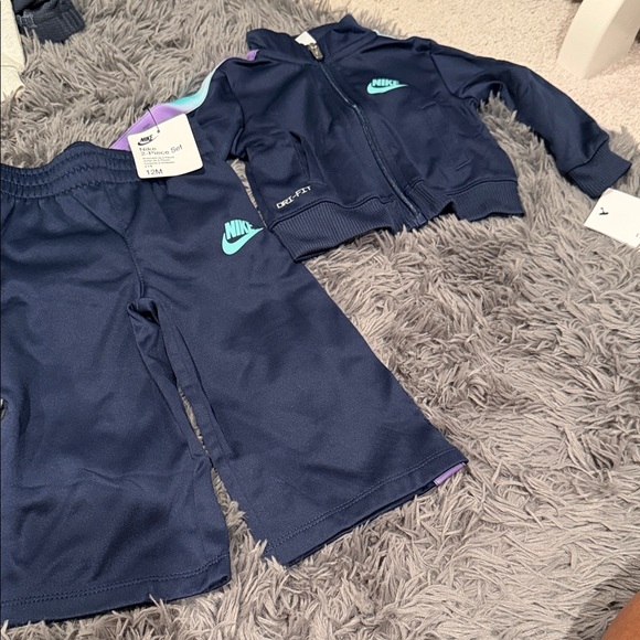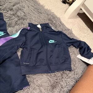 Nike tracksuit with a zip-up jacket and pants. Dark blue with teal logo accents. Ideal for everyday comfort.