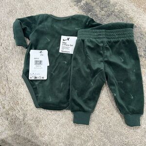 Charming Nike set for newborns. Includes a dark green onesie and matching pants.