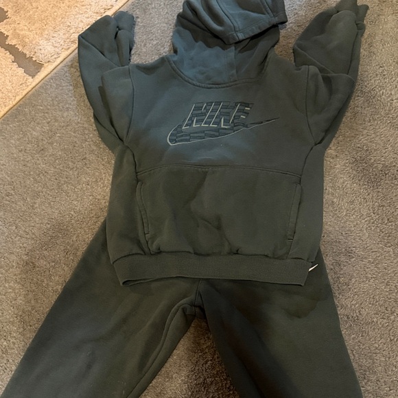 Stylish dark green tracksuit with hoodie. Features iconic Nike logo. Ideal for everyday comfort.