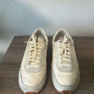 Worn but still I’m good condition. Don’t reach for as often anymore! Super comfortable. I think the color is “white gum”.
