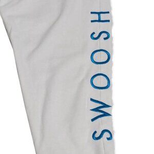 These joggers/sweatpants by Nike feature the double swoosh logo in embroidered neon yellow, the text "SWOOSH" in embroidered blue on the side, and text about the swoosh logo in embroidered blue on the other side. They're made of 80% cotton/20% polyester, and have a built-in band of elastic and a drawstring at the waist. They also have 2 side pockets and one back pocket.