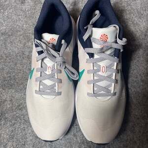 Nike Downshifter 12 running shoes in White and Clear Jade (DD9294-103) for women, size 9. These athletic sneakers feature a lightweight design, perfect for everyday running or casual wear. The clean white upper is accented with a vibrant clear jade Nike swish and subtle pink details, sitting atop a comfortable white midsole. The durable outsole provides reliable traction and support. This pair is new, never worn, and comes in its original packaging. Please refer to the photos for exact condition and sizing details.