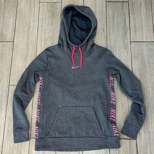Cozy speckled gray hoodie with funnel neck with hot pink strings, signature swoosh, and Nike print on both sides of the sweater. Perfect for casual wear or workouts. Features a comfortable fit and stylish design in excellent used condition.