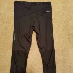 These are your favorite Nike Dri Fit capris for running, yoga, or just because you don't feel like getting dressed to run to the store. Color is black with reflective silver swoosh and design on bottom of legs. Inseam measures 23", outseam is 29" and waist is 13" across lying flat. Size is XS. Tie inside at waist and zip pocket in back top of buttocks. 92% polyester and 8% spandex. EUC