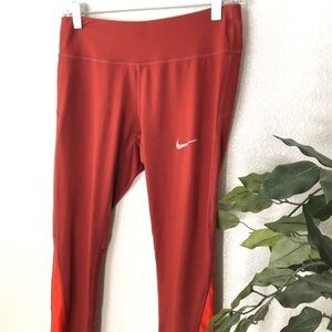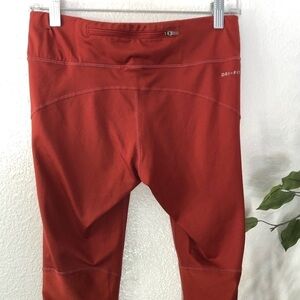 A unique colored cropped leggings with a draw string on the inside band. Bright orange mesh in the front and darker red mesh in the back make these breathable and comfortable. Add to your workout wardrobe. Only sign of wear is the inside tag