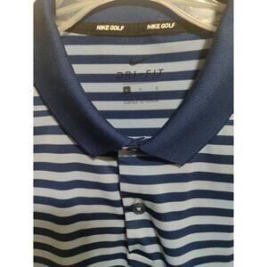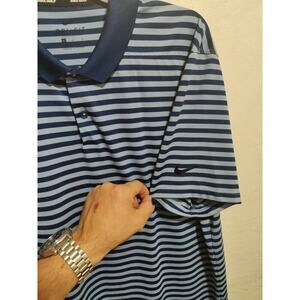 This Nike Dri Fit polo shirt is perfect for any athletic occasion. The collared neckline and button closure provide a classic look, while the blue and light blue striped pattern adds a touch of style. The shirt is made of 100% polyester and features Nike's Dri Fit technology, ensuring breathability and comfort during any activity.