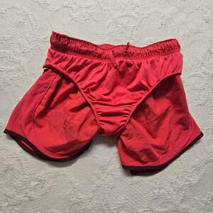 These neon pink Nike Dri Fit running shorts are made for the cute Barbie girl who loves to wear athleisure on a hot summer day. Sewn in briefs, stretchy elastic waistband with a built in tie, single pocket in panty lining, black logo and trim with mesh paneling.