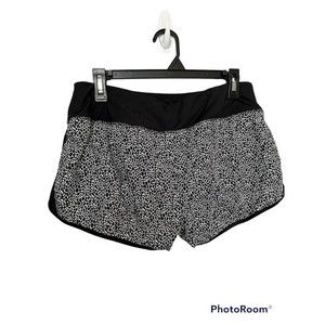 Nike swoosh on front is wearing off but not noticeable due to busy print