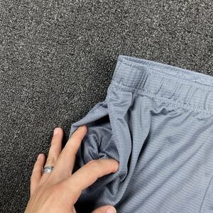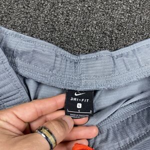 The product is a pair of Nike Dri Fit shorts in youth size large, designed for basketball and training activities. These lightweight shorts feature a solid gray color with a drawstring closure and a mid-rise fit. Made from a blended fabric, they are machine washable and perfect for summer, fall, and spring seasons. The athletic style and regular fit make them comfortable for active boys who enjoy playing basketball or engaging in other physical activities.