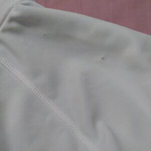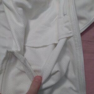 This jacket was only tried on and never worn. However, when I was trying on the jacket my cat decided to jump on me and made pulls in the jacket. It has been hanging in the closet ever since.