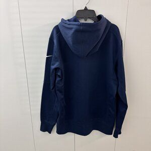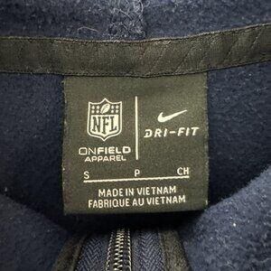 The Nike Dri Fit Tennessee Titans Sideline On Field Full Zip Hoodie in Men's size small is an officially licensed hooded sweatshirt designed for football fans. The navy blue color and team logo make it the perfect choice for Titans supporters. Made by Nike, known for their quality athletic apparel, this hoodie is perfect for showing off your team spirit on game day or anytime you want to stay warm and comfortable in style.
