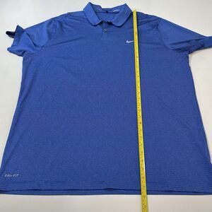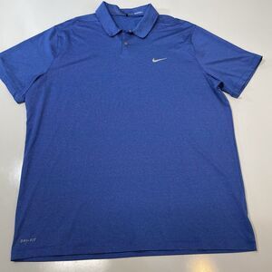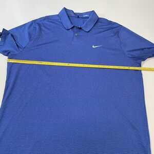 The Nike Dri Fit Tiger Woods Collection Snap Golf Polo in Blue is a men's shirt designed for golfing. This polo features a collared neckline, short sleeves, and a snap closure. It has a striped pattern and is made with breathable fabric suitable for all seasons. With a regular fit and size 2XL, this Nike polo is part of the Tiger Woods collection, making it a stylish and functional choice for both activewear and casual occasions.