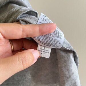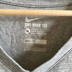 Great running top from Nike Dri Fit. Shirt is a v neck short sleeve top in heather gray. Features the word RUN on the front with the nike logo swoosh, both are in blue and black abstract print that has a cheetah look to the print. Excellent condition. Size Medium. Bust: 18.5" across. Top to bottom in back: 24.5"