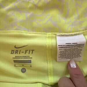 The Nike Dri Fit Victory Pleated Tennis Golf Skort in Medium size is a vibrant neon yellow skort perfect for active women. Made of polyester with a relaxed fit, this athletic skort features an adjustable waist for comfort during activities like tennis, golf, cycling, or fishing. Machine washable and crafted in Cambodia, this stylish skort is suitable for all seasons, making it a versatile and functional addition to any wardrobe.