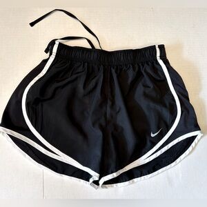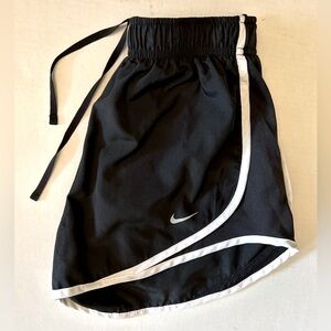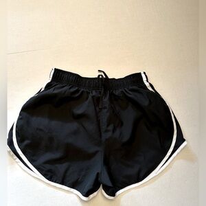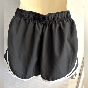 Nike black shorts with white trim & built in liner. These are 100%poly & have elastic waist with inner drawstring and tiny hidden pocket. Pre owned in good condition.