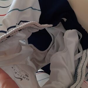 Nike Dri Fit size medium red, white, and blue striped athletic shorts. Has built in underwear. Good pre-owned condition, one spot on front as shown in pictures 8 and 9. Smoke free pet friendly home. Please see pictures for measurements. Shorts athletic red white blue Dri Fit medium Nike
