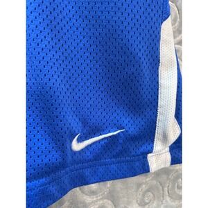 A pair of Nike Dri-FIT athletic shorts perfect for workouts or casual wear. These shorts feature a breathable mesh fabric in a vibrant blue, accented by a white Nike swoosh logo on the lower right leg. Designed with an elastic waistband and an adjustable drawstring for a secure and comfortable fit. These versatile shorts offer a blend of performance and style.