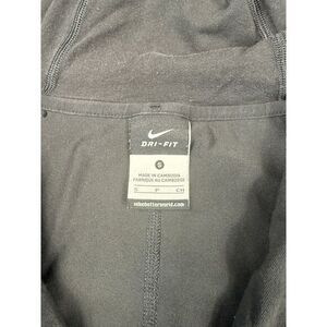 Sleek black Nike Dri-FIT zip-up hoodie perfect for workouts, running, or casual wear. Features moisture-wicking technology to keep you dry and comfortable during exercise. Ribbed cuffs and hem provide a secure fit. Hood with drawstring offers adjustable coverage. Front zip pockets for storage. In good condition with minimal wear.