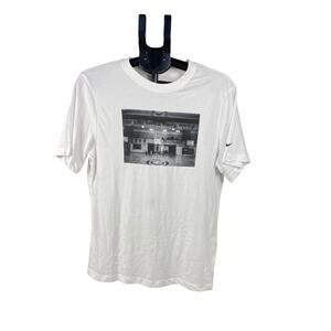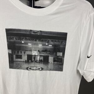 Elevate your court style with this rare Nike Dri-FIT Graphic Tee in crisp white, featuring a bold black-and-white basketball court photo with the motivating phrase: “Eat. Sleep. Practice. Practice. Practice.” Lightweight and breathable, this tee is crafted with Nike’s Dri-FIT technology to wick sweat and keep you cool during workouts or casual wear.