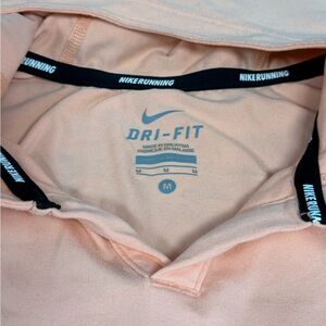 Light orange Nike hoodie with Dri-FIT. Features branded drawstrings.