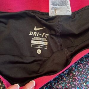 Nike athletic shorts with a vibrant speckled design. Features pink trim and Dri-FIT technology.