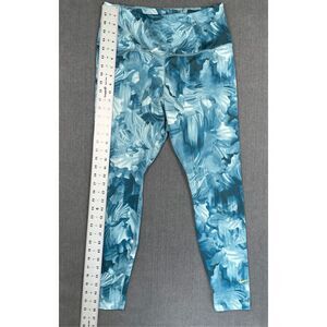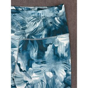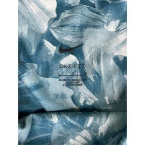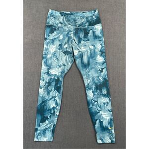 Nike Dri-FIT leggings featuring a striking blue abstract floral brushstroke pattern and high-rise waist for supportive, performance-ready comfort. Made with moisture-wicking fabric, these full-length leggings are ideal for training, yoga, or athleisure wear. Light overall pilling from wash/wear—does not affect function or bold visual appeal. Please see photos for measurements.