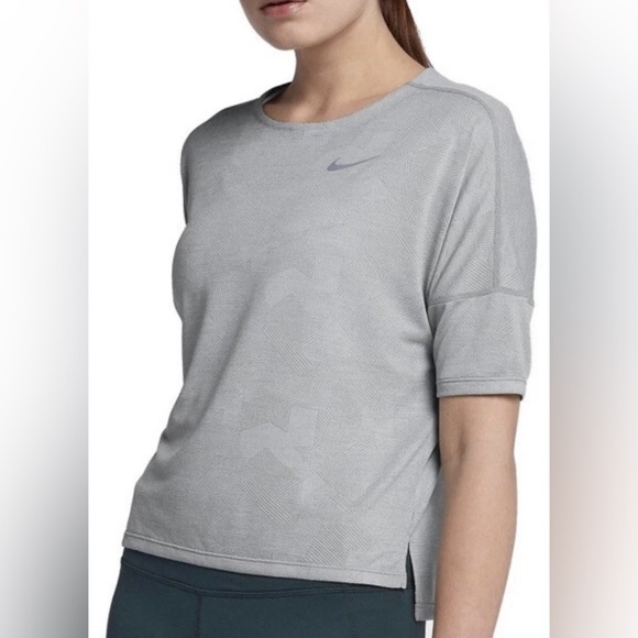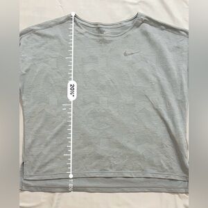 Nike Dri-FIT tee in color Noise Aqua/ Grey. Geometric pattern on shirt with a silver Nike Logo. High low cut makes it breathable and great for the gym/ lounging.