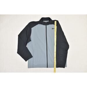 This is a Nike Dri-FIT Men's jacket in a stylish black and gray color block design. The jacket features a full-zip closure and is made of 100% polyester, offering a comfortable and lightweight feel. The Dri-FIT technology helps to wick away sweat, making it ideal for various athletic activities or casual wear. The jacket is a Regular Size XL and is in excellent used condition with no visible stains, tears, or damage. The iconic Nike swoosh logo is embroidered on the chest. The measurements are provided in the images to ensure a perfect fit.