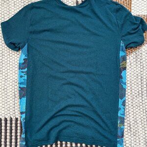 This Nike Dri-FIT performance top is perfect as a standalone workout shirt or a high-performance base layer. It features a bold green body with striking blue camo mesh paneling on the sides for maximum breathability.