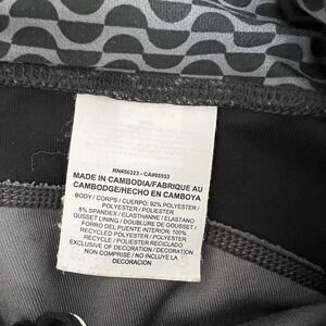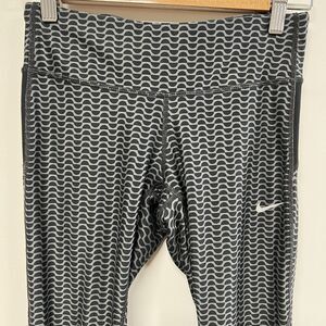 Style: Nike DriFIT cropped leggings in size XS, featuring a chic grey-and-black half polka dot print, reflective accent, internal drawstring, and convenient zip back pocket.