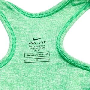 This Nike Dri-FIT Pro sports bra offers medium support with sweat-wicking technology, perfect for training, yoga, or everyday active wear. The racerback design and wide elastic band ensure a secure and comfortable fit, while the breathable fabric enhances ventilation during intense workouts. Featured in a vibrant green hue with classic Nike branding, this size M bra is both stylish and functional. Made in India, it weighs 4 oz and is in excellent condition with no