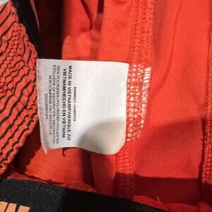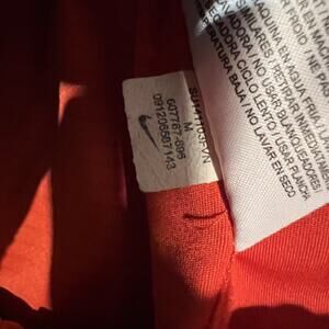 Red with black horizontal stripes and large 'NIKE' branding on left leg