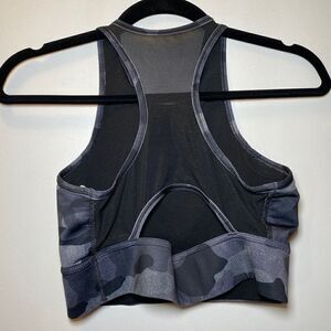 • The high neckline helps keep you covered while you work out or compete. Camo print on shiny fabric creates a commanding look.