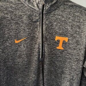 This Nike Dri-FIT Tennessee Volunteers 1/4 Zip pullover is a women's athletic top in size L, featuring a solid gray color with the University of Tennessee Volunteers logo. The long sleeves and 1/4 zip neckline make it suitable for activewear, particularly running and jogging, in various seasons. Made from a blended fabric, the pullover is machine washable and offers a comfortable athletic fit with thumb holes for added functionality. Perfect for showing team spirit while staying active or casual wear. 20 inches from arm pit to arm pit 27 inches in length In excellent like new condition!