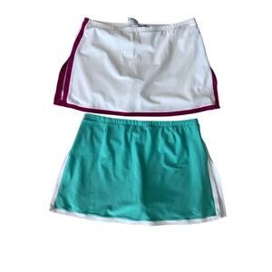 Both skorts are in good condition and ready for the court. One is a crisp white, and the other is a refreshing teal color.