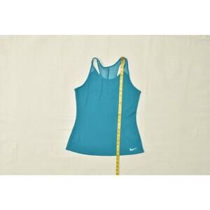 16The Nike Dri-FIT Women's Blue Ribbed Racerback Athletic Tank Top in size M is a stylish and comfortable piece of women's clothing. Made of polyester, this sleeveless top features a solid blue color and a racerback design for added breathability during workouts or casual wear. With a pullover closure and machine washable care instructions, this tank top is perfect for summer and spring seasons. The Nike brand ensures quality and durability, making it a versatile addition to any wardrobe.