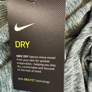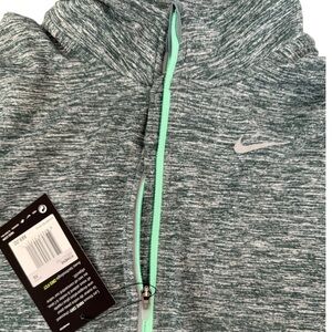Stay cool and comfortable in this Nike Dri-FIT running top, designed to wick moisture and keep you dry through every mile. Featuring a soft, lightweight heathered fabric in a mint green tone with contrast half-zip closure, this long-sleeve top includes thumbholes for added warmth and reflective elements for visibility. Perfect for layering during cooler weather runs or wearing solo for workouts, errands, or everyday activewear. New with original tags. Excellent condition with no flaws.