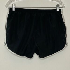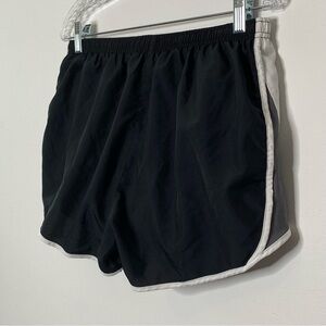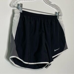 Nike Dri Fit black running shorts. Elastic waistband with drawstring inside waist, built in black brief. Brief has hidden waistband pocket. White and grey detail trim on shorts.