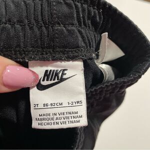 Gently worn boys size 2T Nike dri-fit black tapered leg jogger sweatpants. Elastic waistband, Please review all photos for any signs of wear-pictured as is. Disclaimer: Any items with any wear/staining has not been treated, and unsure of ability to remove/treat condition. Comes from a smoke free home, bundle with other items to save & minimize shipping cost.