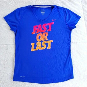 Nike Dri-Fit Blue Running Top T Shirt Sz M “Fast Or Last” V Neck Short Sleeve