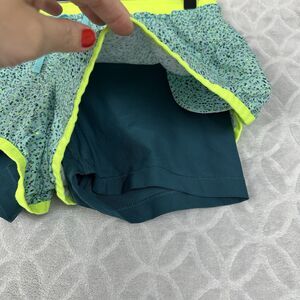 * Shorts: Multi-color blue & neon yellow with inner teal bike style short, mid-rise, elastic waist, drawstring, hidden side pockets