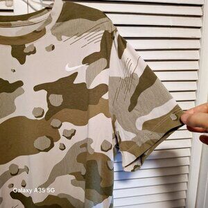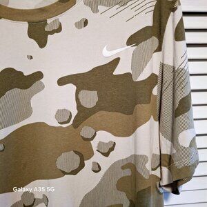 This Nike Dri-Fit t-shirt features a green and beige camouflage design, offering moisture-wicking fabric for comfort during workouts or casual wear.